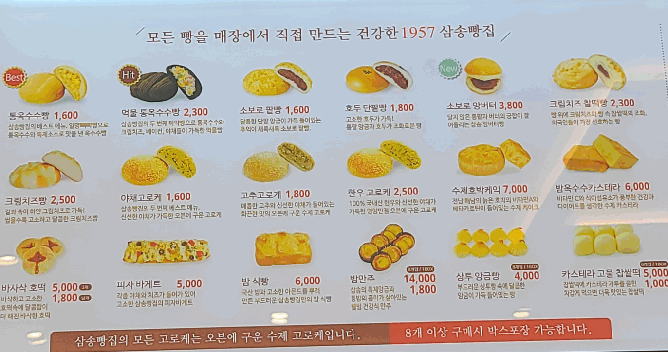 삼송빵집 옥수수빵 외 종류 가격