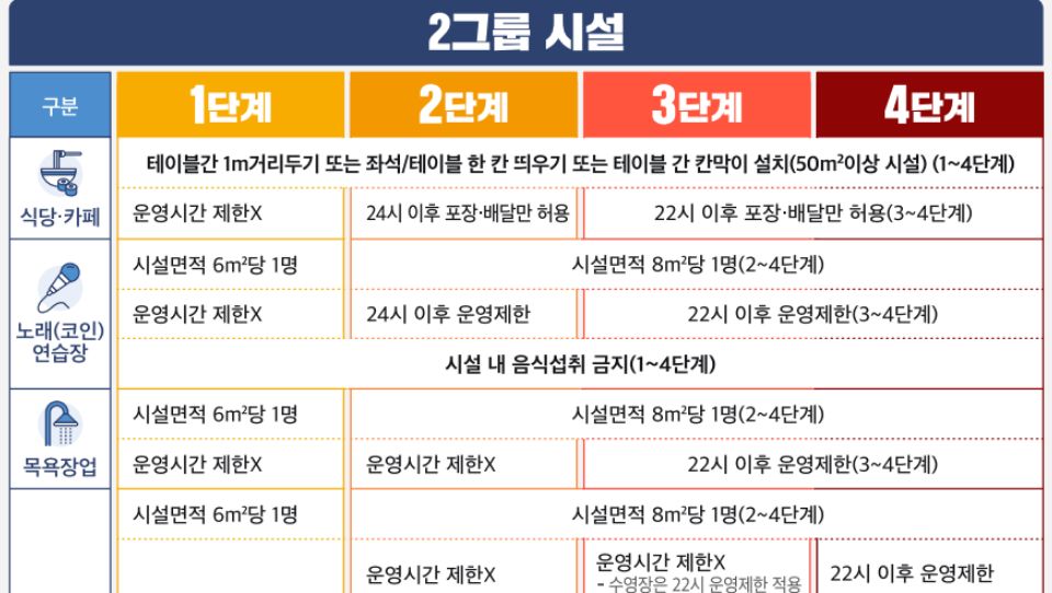사회적 거리두기 단계는 감염 발생 위험과 파급력에 따라 다중이용시설을 1그룹, 2그룹, 3그룹으로 나누고 위험도가 높은 그룹에 대하여 방역 관리를 차등적으로 강화한다고 합니다. 진짜 한숨만 계속 나오네요.
