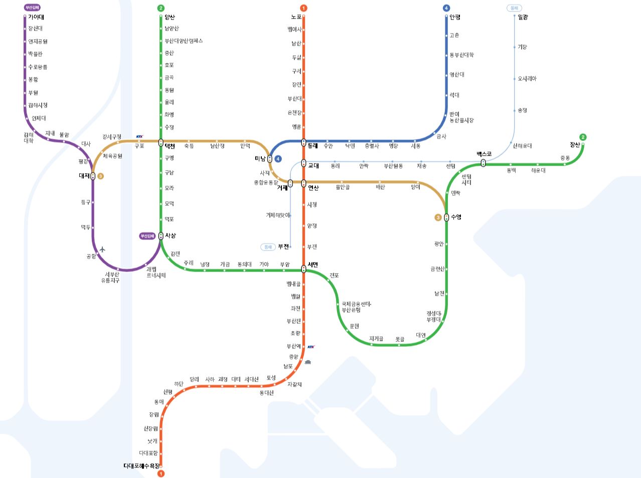 부산 지하철은 1호선, 2호선, 3호선, 4호선, 동해선, 부산김해 노선이 있다.