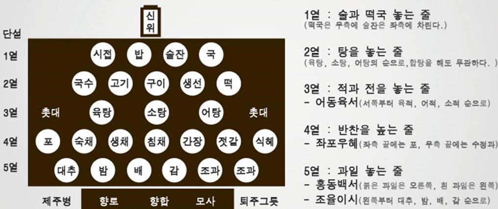 5열 조율이시 - 왼쪽부터 대추, 밤, 배, 곶감 순서로 놓으며, 홍동백서 - 붉은 과일은 동쪽으로 하며, 읜과일은 서쪽으로 하며 이때 사과나 배는 위 아래만 잘라 올리고 밤은 껍질을 까서 놓습니다.