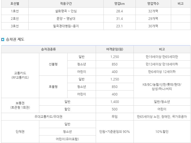 대구 지하철 요금은 다른 지역과 다르게 구간 요금이 없으며 전구간 동일한 요금으로 이용 가능합니다. 대구 지하철 이용시 현금 지불은 1,400원이며, 카드 지불 요금은 1,250원 입니다. 청소년이나 어린이는 교통카드를 이용하는 것 이 좋습니다.